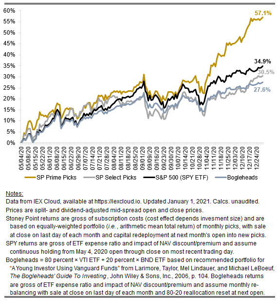 But first, a quick December update. Both Stoney Point’s Prime picks and Select picks demolished the market in December. The market (proxied by the SPY ETF) was up 2.71 percent (the Bogleheads’ “young investor” portfolio performed similarly, at 2.70 percent for the month). The Prime picks were up 8.74 percent. The Select picks were up 6.94 percent, and have now passed the Bogleheads portfolio on a cumulative basis. This isn’t just Nasdaq exposure: the Nasdaq-tracking QQQ ETF was only up 4.12 percent in the period (and our picks are selected from the S&P 500 universe, not that Nasdaq universe, although there is some overlap).