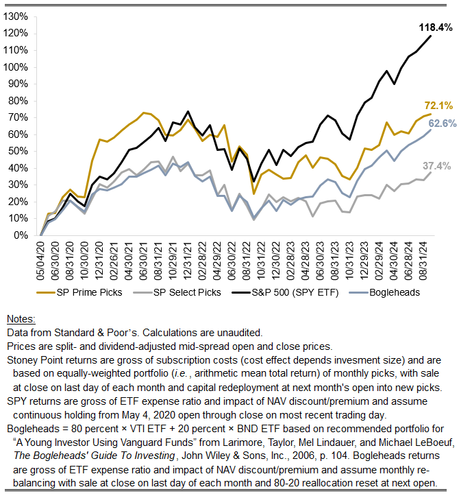 As is often the case, discussion about the stance of monetary policy and the health of the economy dominated market analysis in the month amid the onset of an expected rate-cutting cycle and a very good jobs report recently. Prime and Select’s returns bracketed another very strong monthly gain for the market overall (proxied by SPY). As the chart below makes clear, SPY’s performance has been stellar the last two years. I generally use “the market” and SPY interchangeably, but a careful look at the chart below calls the wisdom of that language into question, and elicits an observation that might inform whether it is reasonable to expect SPY’s outperformance to persist over time. Specifically, both SPC’s prime strategy and the Bogleheads portfolio overlap SPY’s holdings to an extent. The former reflects, by construction, a narrow subset of SPY’s constituents. The latter, in contrast, reflects a much broader universe of holdings. Yet both the narrow subset (Prime) and the broader universe (Bogleheads) have performed essentially in lockstep in the last two years, while SPY has dramatically outperformed both. One feature that Prime and the Bogleheads portfolio share in common that distinguishes each from SPY is a much lower weight (or indeed no weight) applied to largest, most salient technology stocks, including those at the forefront of the so-called AI revolution (Bogleheads’ VTI holding, for example, tracks the CRSP Total Market Index, rather than the S&P 500 index).