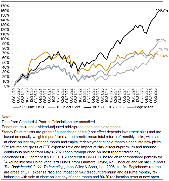 - Initial investment on the date indicated and rebalancing using Stoney Point’s Prime and Select models (respectively) at the end of each month.